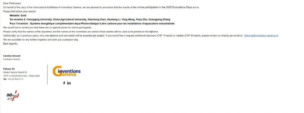 绿建中心成员陈肖萌老师的创新项目“面向工厂化渔业养殖设施的零碳渔光互补系统”(Zero-Carbon Aqua-Photovoltaic Complementary Energy System for Industrialized Aquaculture Facilities) 在本届日内瓦国际发明展上斩获金奖。