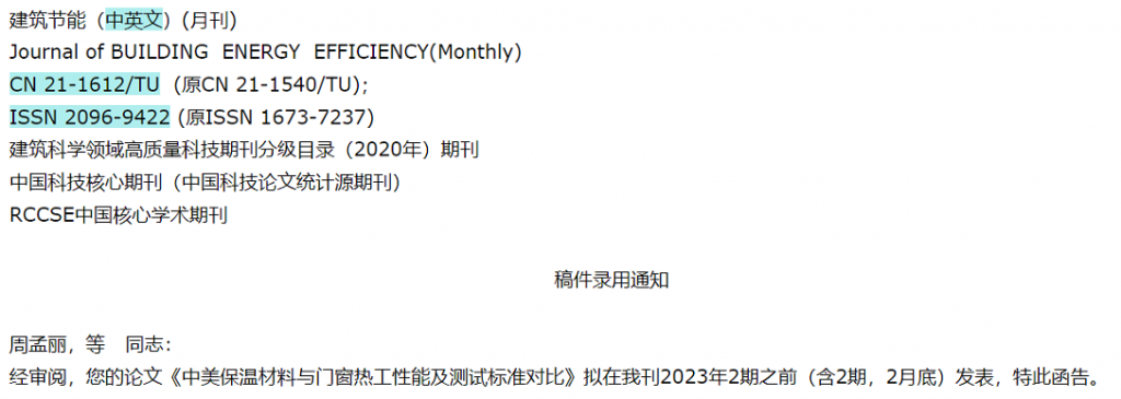 团队成员周孟丽同学的论文《中美保温材料与门窗热工性能及测试标准对比》已被《建筑节能(中英文)》成功录用。