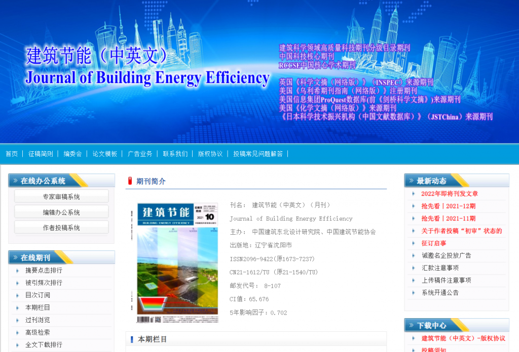 《建筑节能(中英文)》创刊于1973年,曾用刊名《硅酸盐建筑制品》《房材与应用》,是由中国建筑东北设计研究院有限公司主管,中国建筑东北设计研究院有限公司、中国建筑节能协会主办、中华人民共和国住房和城乡建设部建筑节能中心、清华大学建筑节能中心和中国建筑学会建筑材料分会协办的建筑节能专业技术期刊。据2020年3月4日中国知网显示,《建筑节能(中英文)》共出版文献9404篇、总被下载960733次、总被引24873次,(2019版)复合影响因子为0.611、(2019版)综合影响因子为0.339。据2020年3月4日万方数据知识服务平台显示,《建筑节能(中英文)》共载文5455篇、基金论文量为1479篇、被引量为24476次、下载量为239491次,2017年影响因子为0.71。