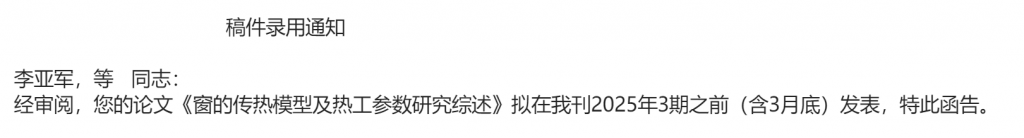 李亚军同学的论文《窗的传热模型及热工参数研究综述》已被《建筑节能(中英文)》录用。