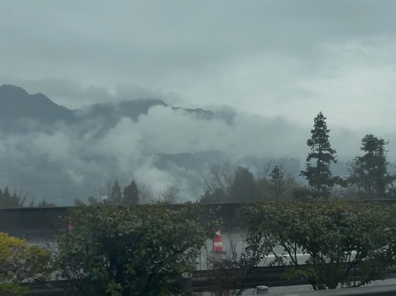 中午时分,我们顺利到达目的地。冬季的四面山景区水汽氤氲,秀丽的山影在雾中隐隐可见。